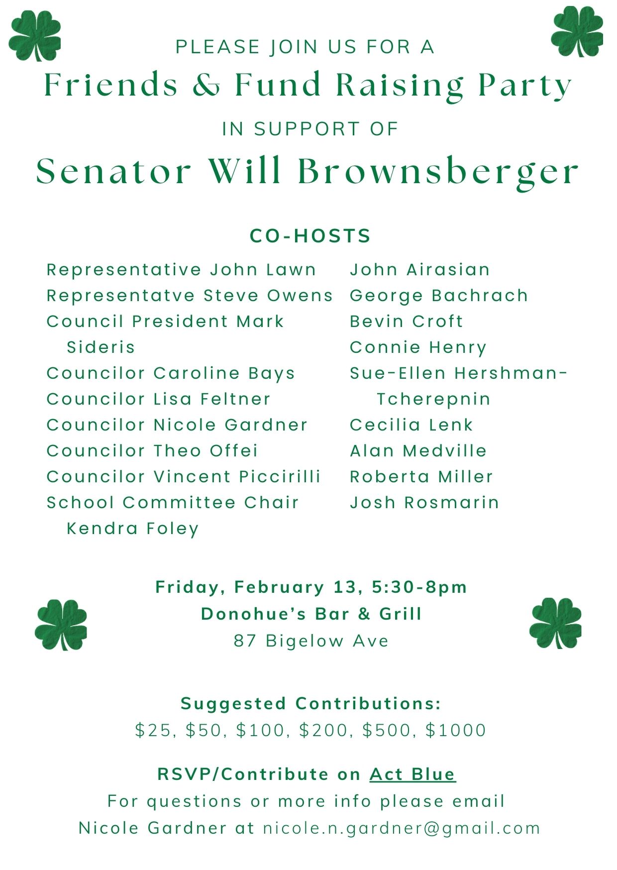 - February 12, 6:30PM, Back Bay, RSVP on ActBlue or by email to caroline.b.reeves@icloud.com (address provided upon RSVP)